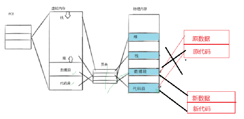 再从下图来理解这一现象,原来的进程有自己的进程地址空间、页表、及内存中存的旧代码和旧数据,此时执行execl时,内存中存着的代码和数据被替换成了新的代码和数据(ls指令的),此时这些数据的物理地址和虚拟可能会发生了变化,只需要更改一下原虚拟地址与新物理地址的映射关系就可以了,而PCB不需要改变。