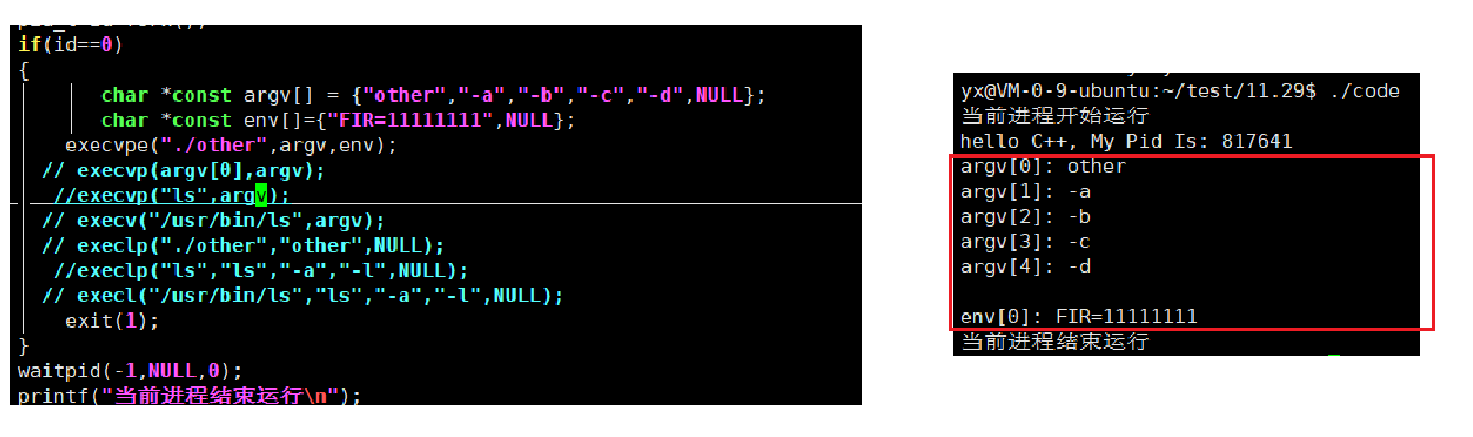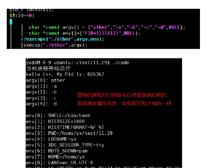 所以执行该替换后的程序的时候就是通过第一个参数找到它,后面的参数会决定替换进程里面的main函数的argv和env,再结合之前知道像ls这样的命令带-a -l 这样的参数会有不同的功能就是通过main函数参数的argv env的,我们就更加能理解第一个参数决定替换的程序,后面的参数代表执行方式这一句话了。