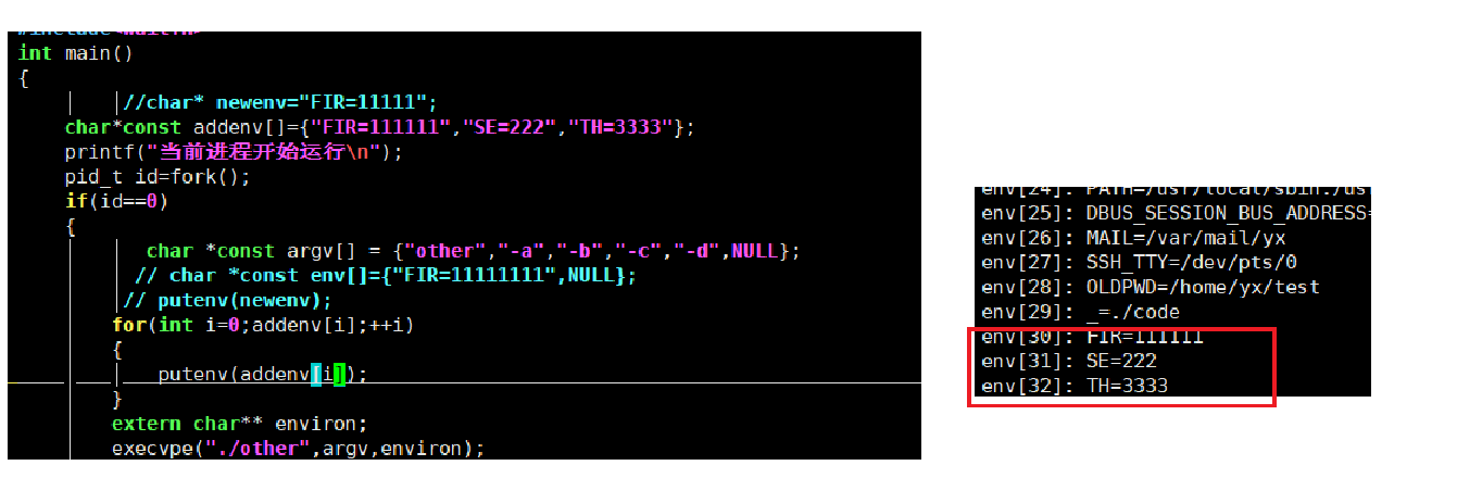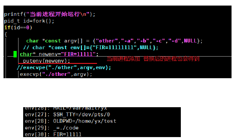 - 先putenv 添加新环境变量到当前子进程的环境变量中, 然后环境变量的参数传environ过去,environ之前学习过就是指向环境变量的指针是个二级指针。被替换后的程序得到environ也就能找替换前子进程的环境变量了。.