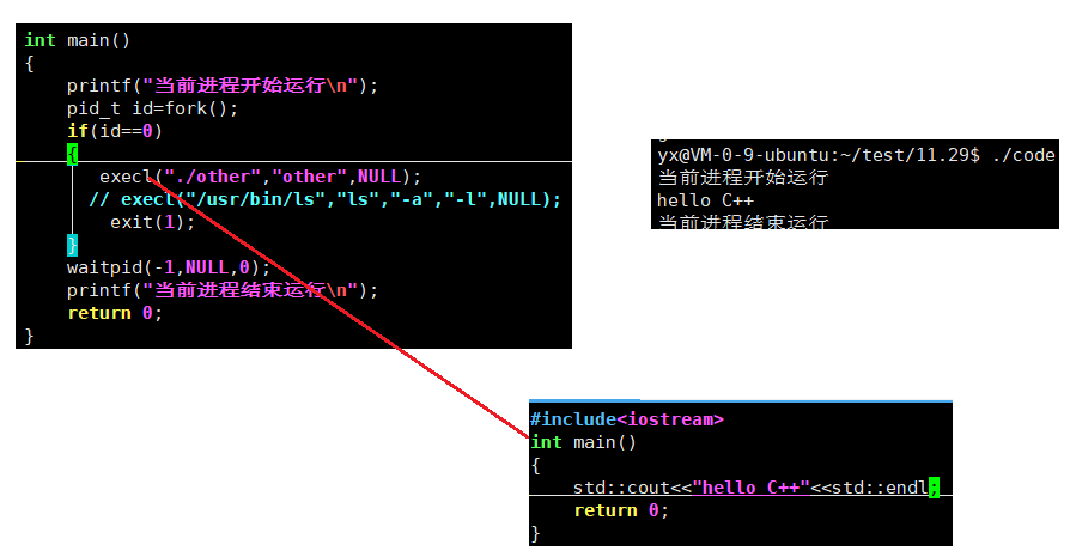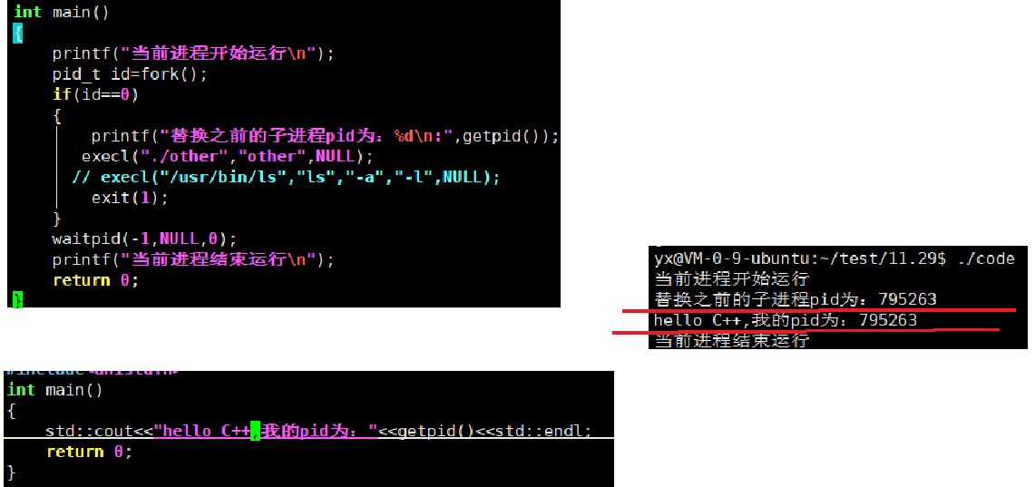 不止c++程序可以被c程序直接替换,python这样的解释性语言和Shell脚本都是可以被替换的,在linux中以进程为载体的都可以进行替换。