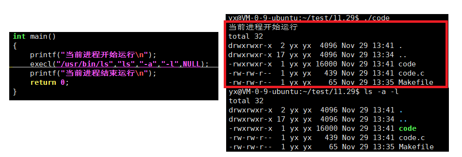 如下的程序,执行的结果只打印了"当前进程开始运行"和ls -a -l的指令的结果,然后就结束了。而"当前进程结束运行"的内容没有打印,相当于execl里面执行的ls -a -l的程序直接把当前的程序的内容给完全替换掉了。