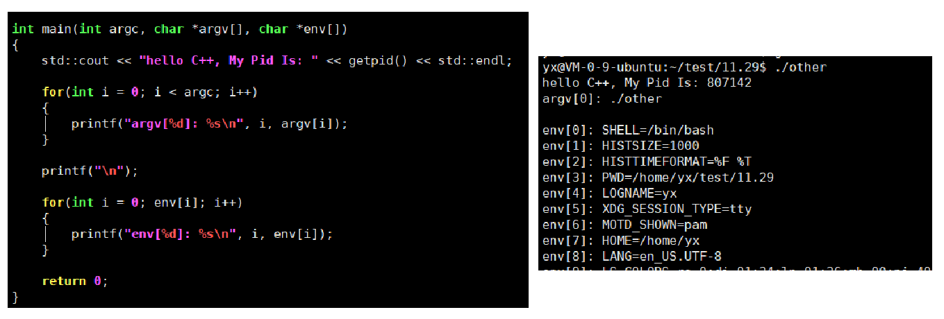 所以我们命令行参数上执行的程序可以理解为:父进程bash创建的子进程通过execv来把命令行参数和环境变量传过去的。