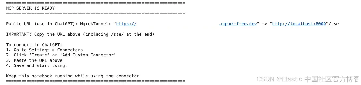 如果你的服务器正在运行,连接会立即生效。无需额外身份验证,因为 Elasticsearch API key 已在服务器中配置。