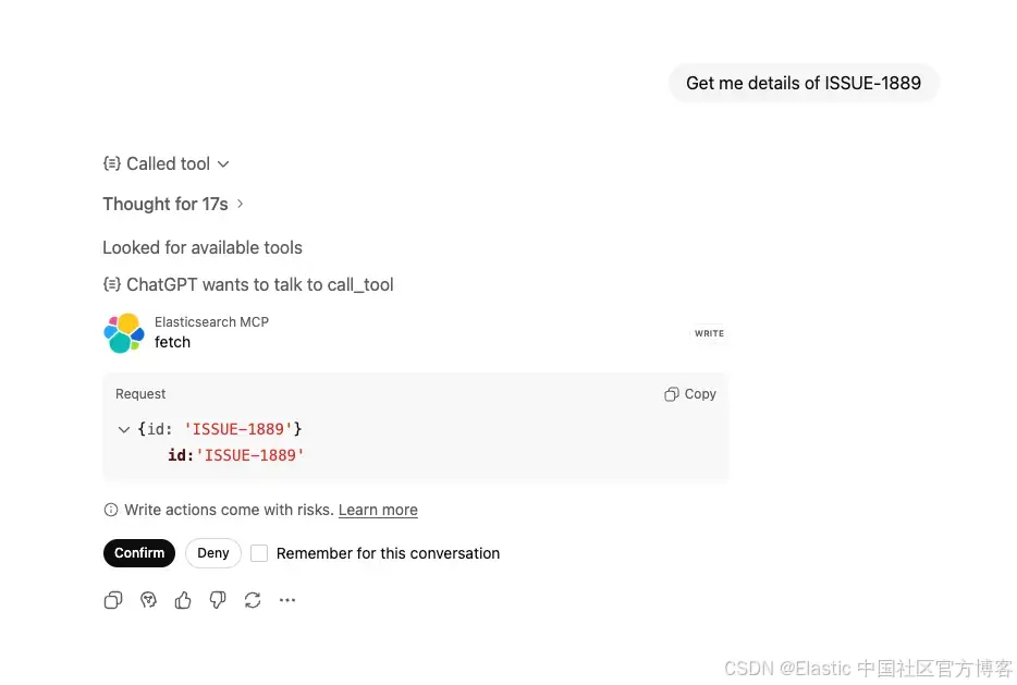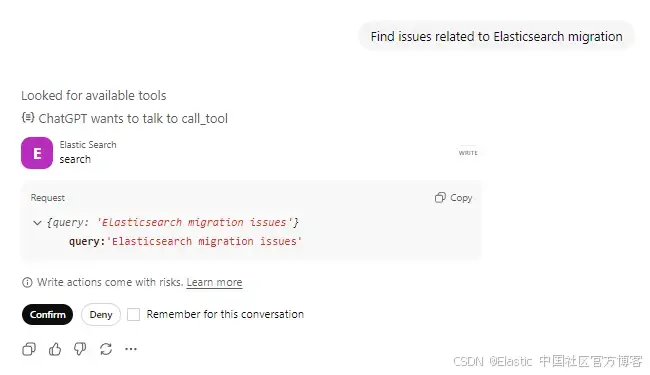 ChatGPT 会使用你的查询调用 search tool。你可以看到它正在查找可用工具,并准备调用 Elasticsearch tool,同时在对工具执行任何操作之前,会先向用户确认。