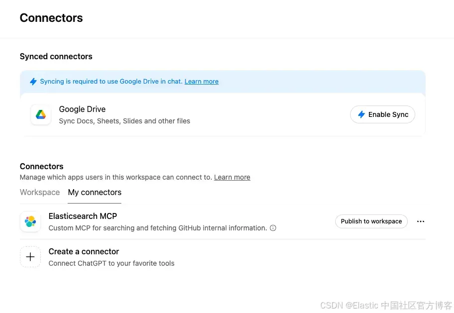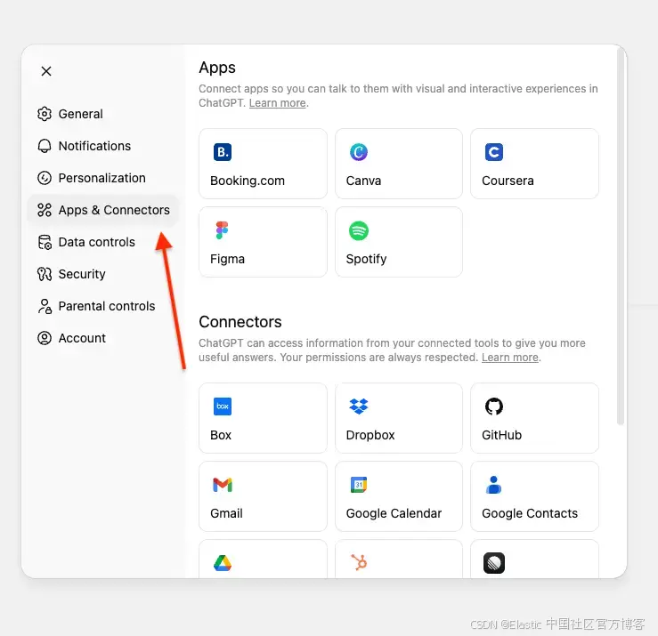 自定义 connectors 让你能够把现有的 ChatGPT connectors 与 Elasticsearch 等额外数据源结合,从而获得更完整的答案。