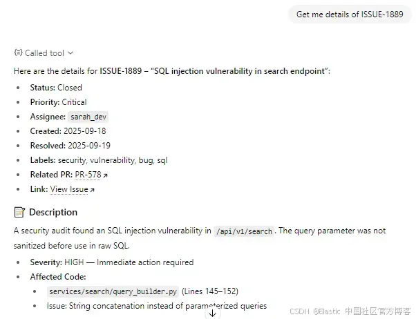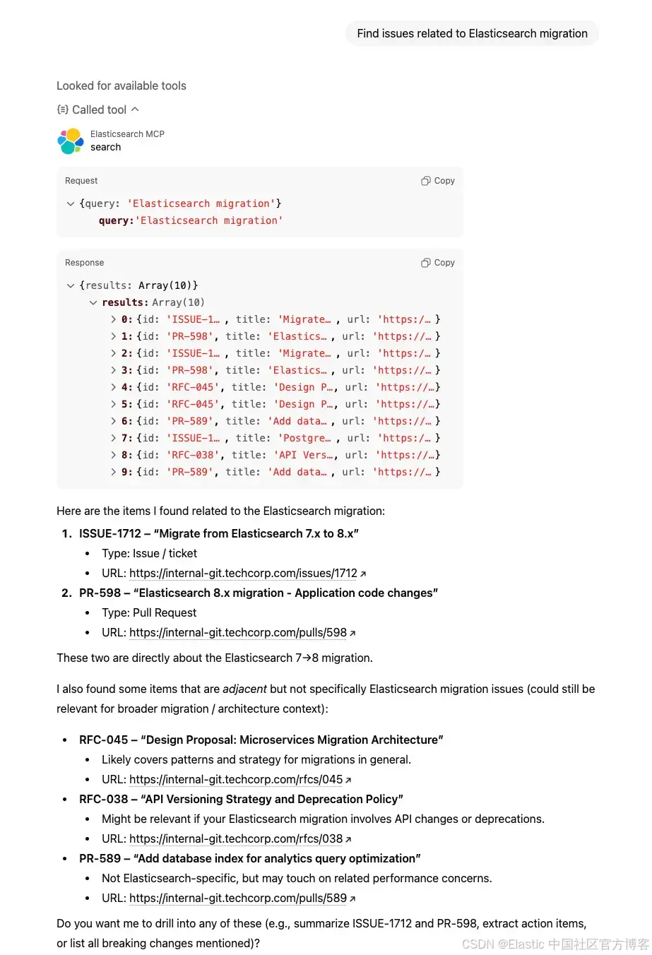 提问: "Find issues related to Elasticsearch migration" 并确认调用了 actions tool。