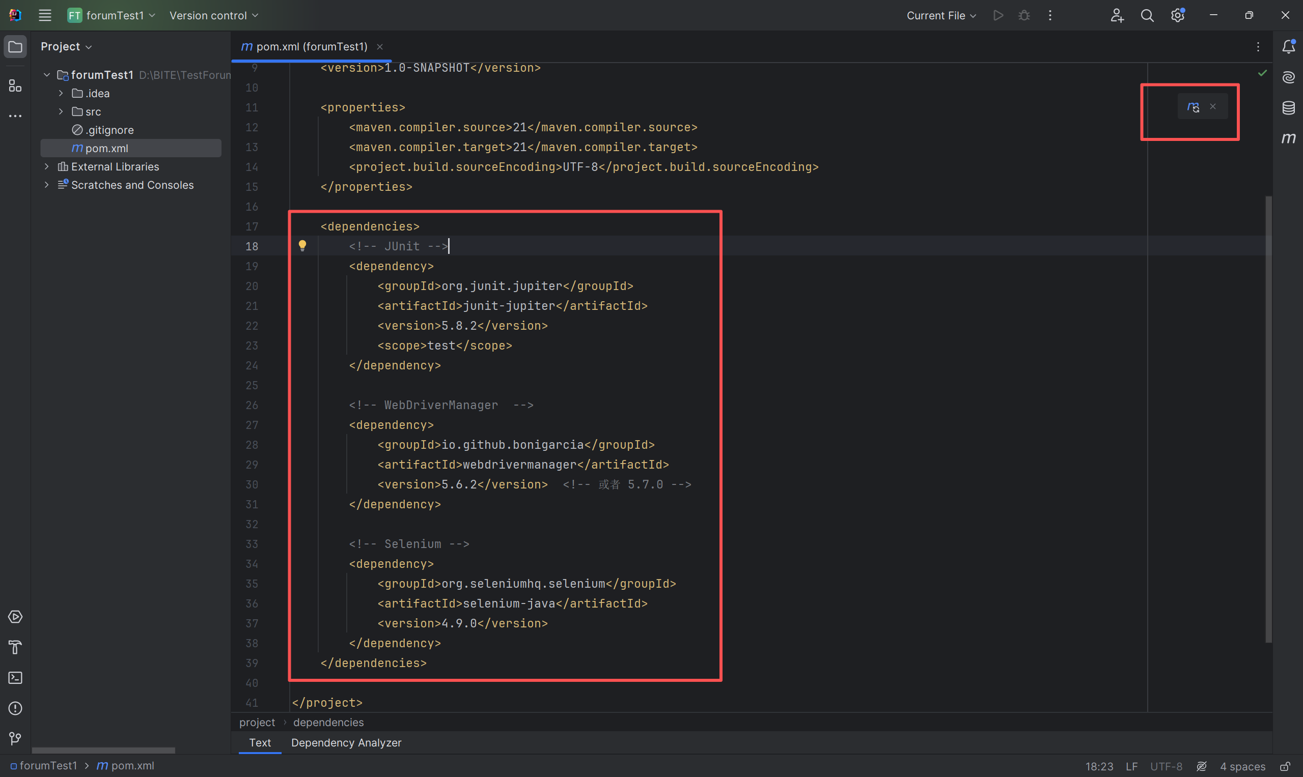 将以上三个依赖粘贴到pom.xml文件中 --->> 点击右上角蓝色m标志