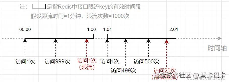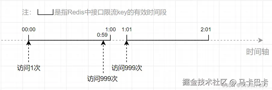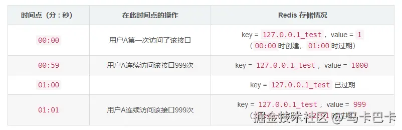 可以发现,00:59和01:01之间仅仅间隔了2秒,但接口却被访问了1000+999=1999次,是限流次数(1000次)的2倍!