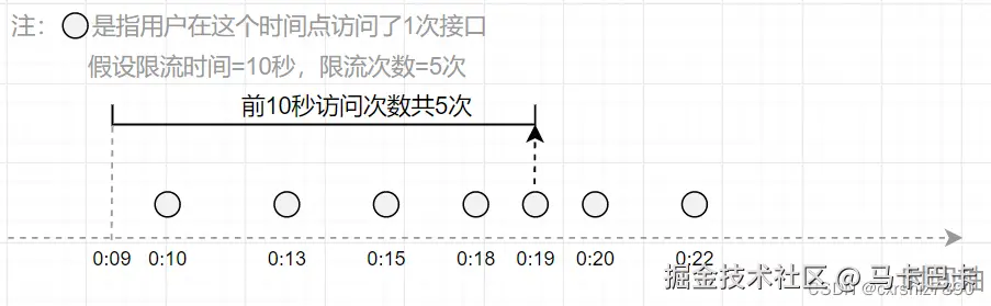 如下图,假设用户在0:19时间点访问接口,经检查其前10秒内访问次数为5次,则允许本次访问。