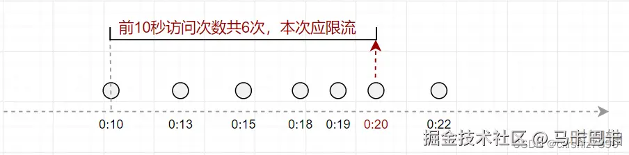 假设用户0:20时间点访问接口,经检查其前10秒内访问次数为6次(超出限流次数5次),则不允许本次访问。