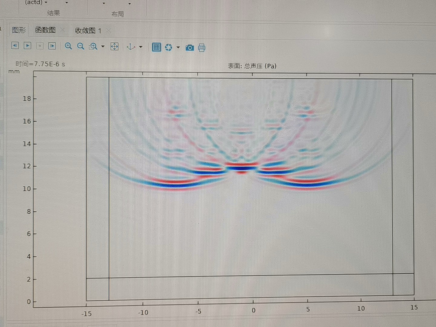 COMSOL---超声相控阵聚焦仿真 模型介绍:激励函数是由高斯波和正弦波组成的脉冲函数
