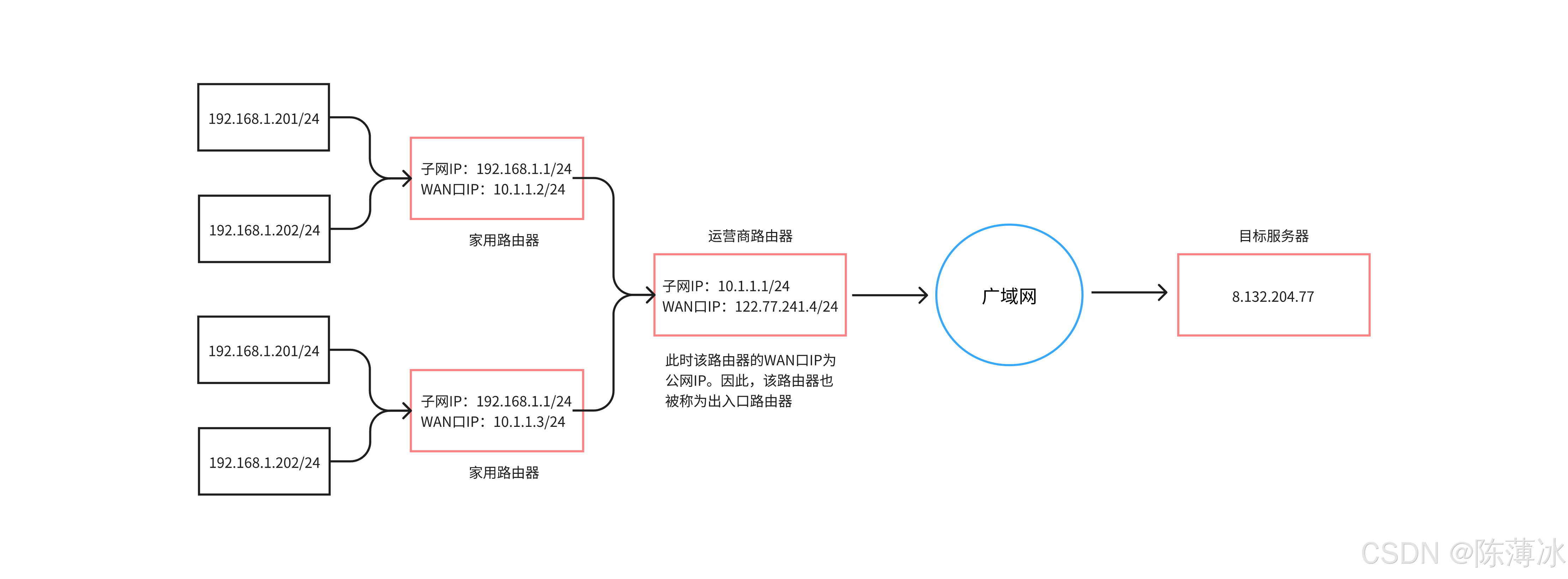 每⼀个家⽤路由器,其实⼜作为运营商路由器的⼦⽹中的⼀个节点。这样的运营商路由器可能会有很多级,最外层的运营商路由器,WAN⼝IP就是公⽹IP。