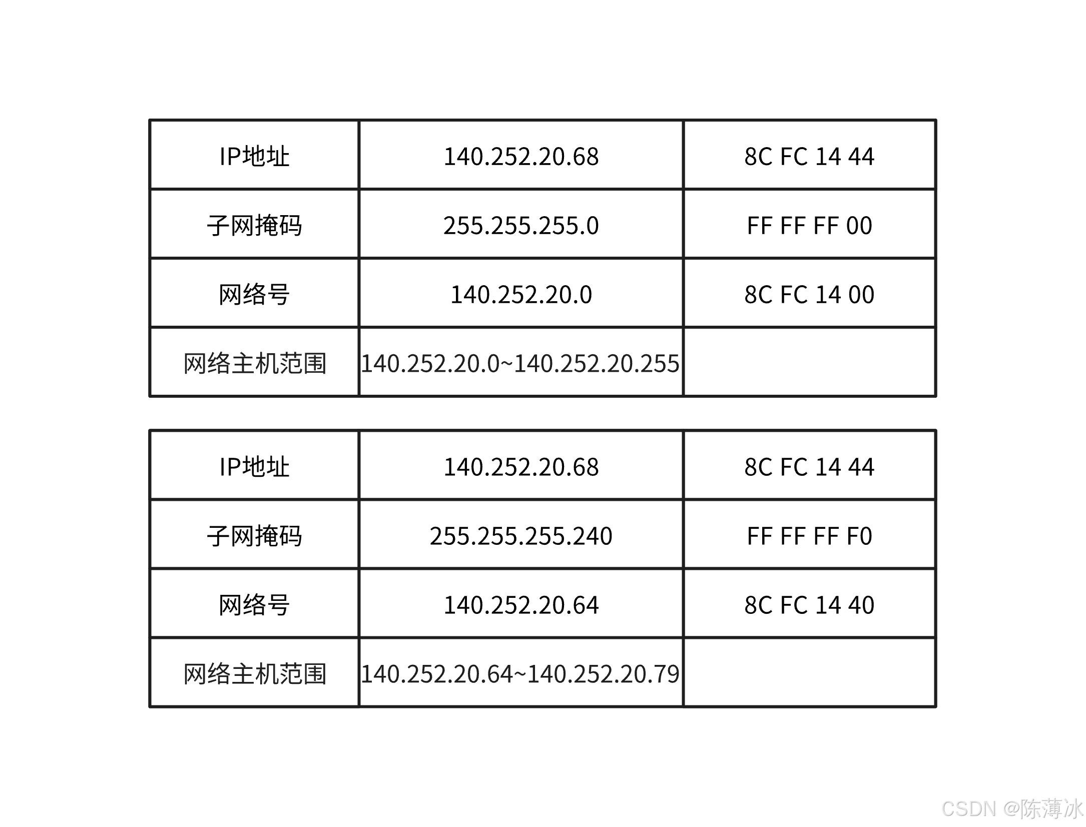 - IP地址和子网掩码还有一种更简洁的表示方法,例如140.252.20.68/24,表示IP地址为140.252.20.68,子网掩码的高24位是1,等价255.255.255.0。