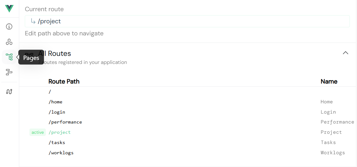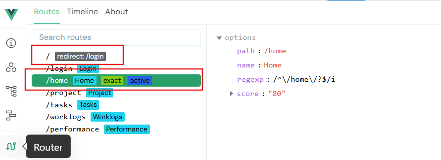 输入路径直接跳转 :在面板底部输入目标路径(如 /home),可手动触发路由跳转,测试路由配置是否正确。