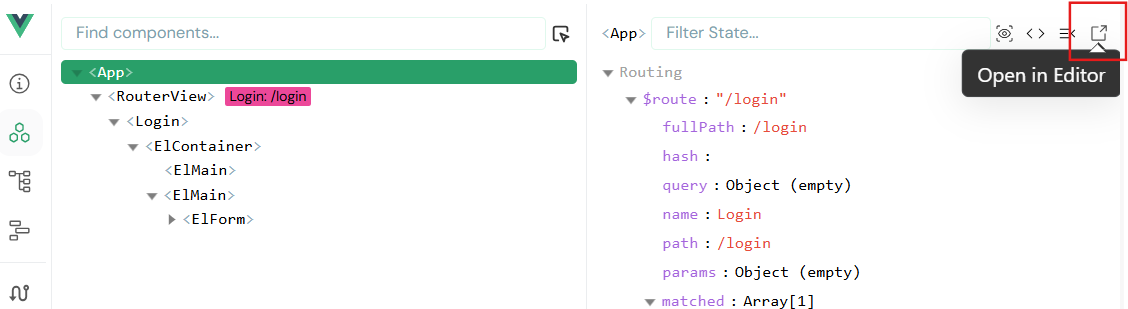 查看应用的组件层级结构,可快速定位到DOM;还可一键在vscode中打开选中的组件源代码,不用ctrl + f 查找你要调试的组件。