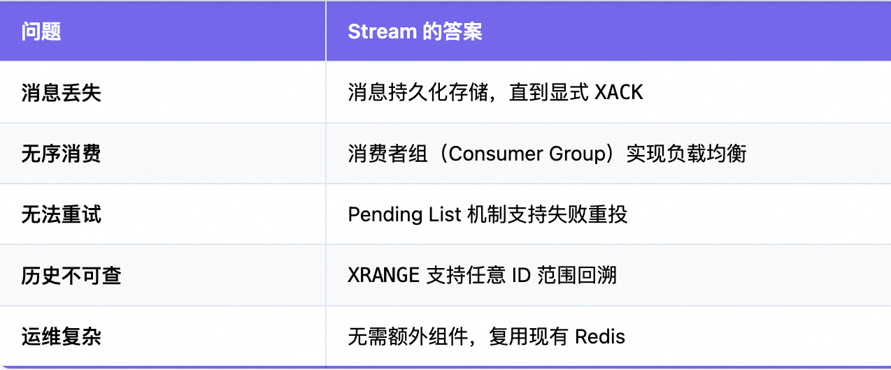 一句话总结:Stream 让 Redis 从"缓存数据库"升级为"轻量级事件总线"。