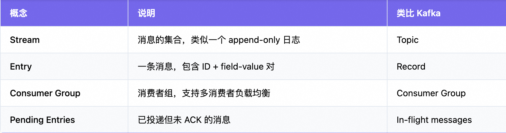 | 消费者组 | 不支持 | 原生支持(负载均衡 + ACK + Pending List) |