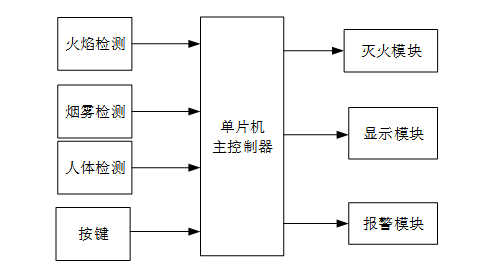 本设计智能家居安全报警系统利用单片机控制技术、传感器检测技术、展开设计,如图2.1所示为本次系统设计的主体框图,系统包括单片机主控模块、火焰检测模块、有毒气体检测模块、按键模块、人体检测模块、液晶显示模块、蜂鸣器报警模块等等,系统采用STC89C52单片机作为主控制器,其负责与各个硬件进行连接,当检测到有火焰时通过继电器打开水泵进行灭火,有有毒气体时进行报警提示,同时具有人员非法闯入检测功能,当打开防护状态时,如果检测到有人则判定为有人非法闯入,进行报警提示.所有的信息都可以通过LCD1602液晶进行显示,