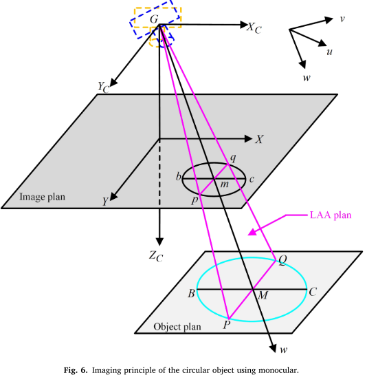 对于检测到的椭圆,根据其长轴端点建立新的坐标系 G-uvw: