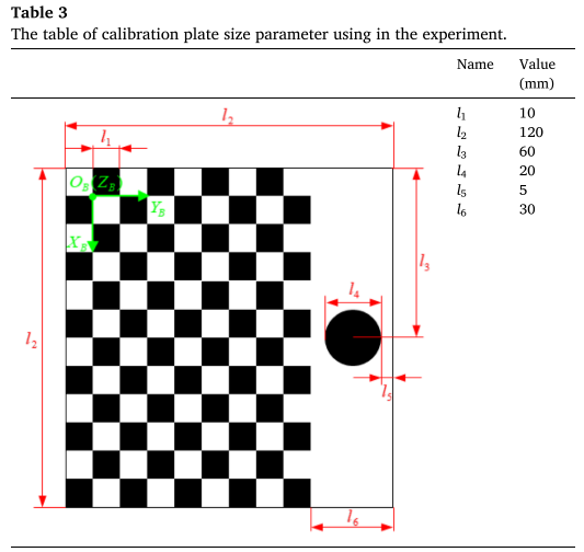 论文设计了一个特殊的标定板,在棋盘格图案上加工了一个半径为10mm的圆形目标,用于验证算法精度。
