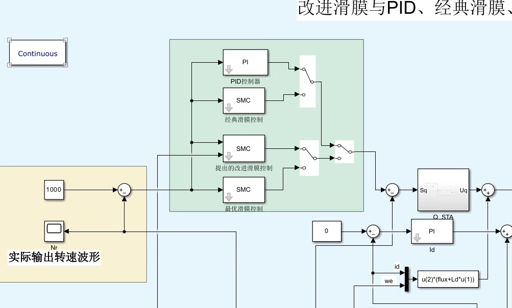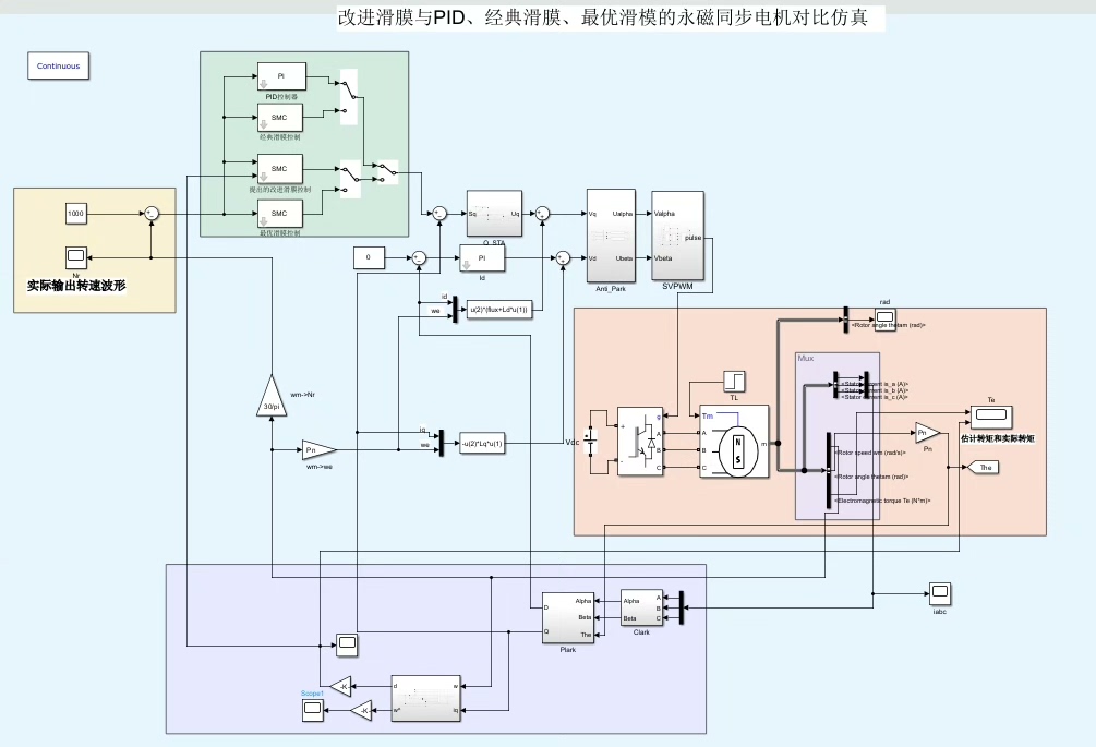 永磁同步电机的控制策略总带着点玄学色彩------参数调好了稳如老狗,调不好就是大型翻车现场。今天咱们拿四个控制方案开刀:传统PID、经典滑膜、改进滑膜、最优滑膜,直接在Simulink里搭擂台比武。先剧透结论:滑膜家族这次集体吊打PID,但改进滑膜和最优滑膜之间还有场血腥内战。