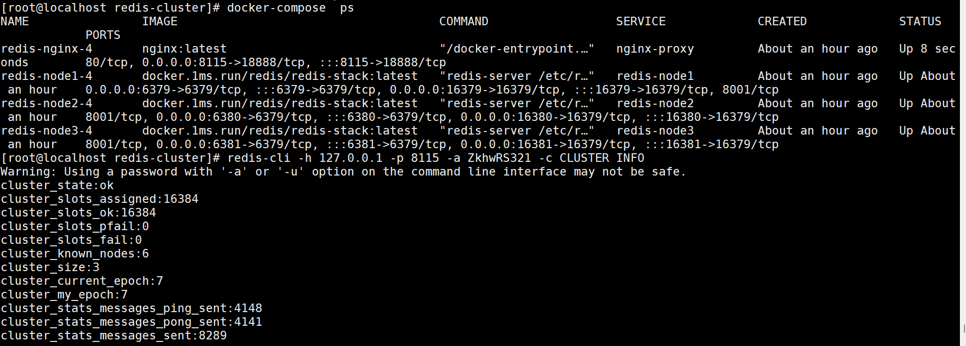 docker exec -it redis-node1-4 redis-cli -a ZkhwRS321 cluster info