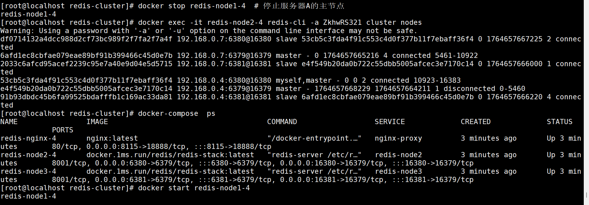 docker stop redis-node1-4 # 停止服务器A的主节点