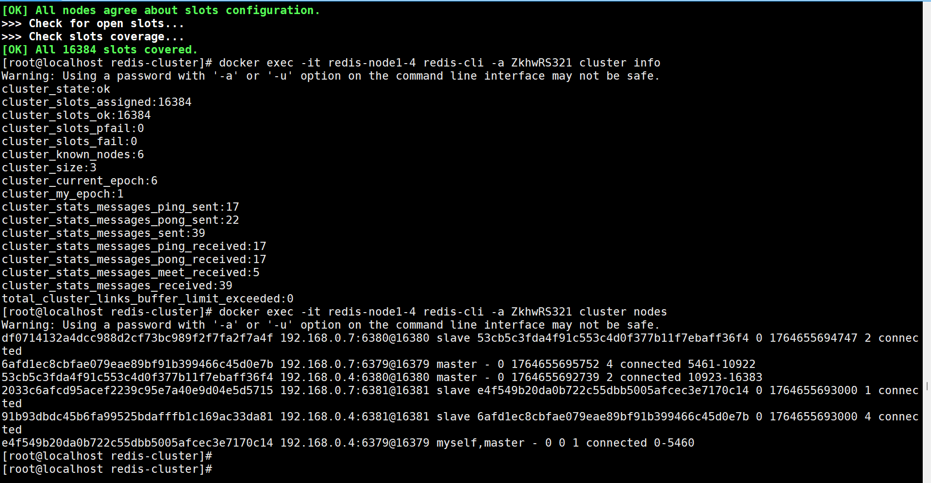 docker exec -it redis-node1-4 redis-cli -a ZkhwRS321 cluster nodes