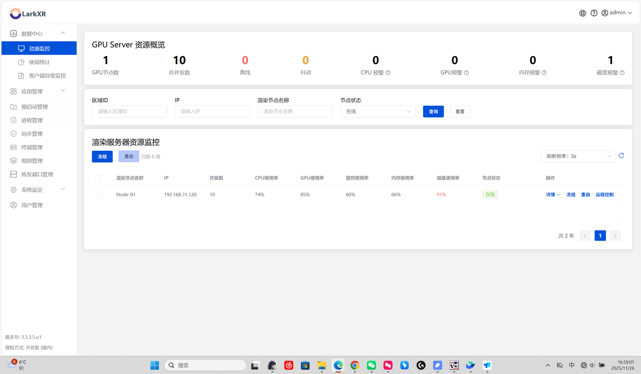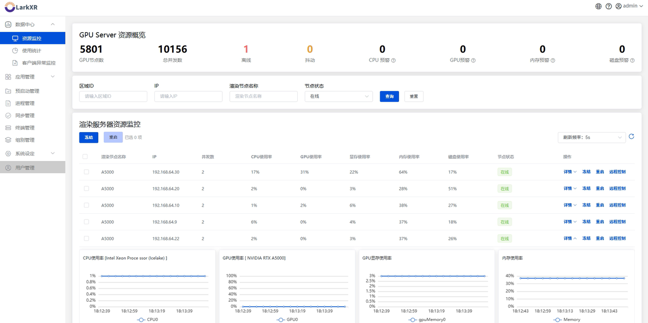实时云渲染基于第三代GPU池化技术,从产品架构上支持**"单机多显卡+一卡多并发+多卡大集群"**的高可用架构,只要单张卡上有资源有余量,就可以继续分配给到更多人同时使用。不受限于 NVIDIA 显卡系列要求限制,GeForce 系列显卡可以突破 8 个并发限制。