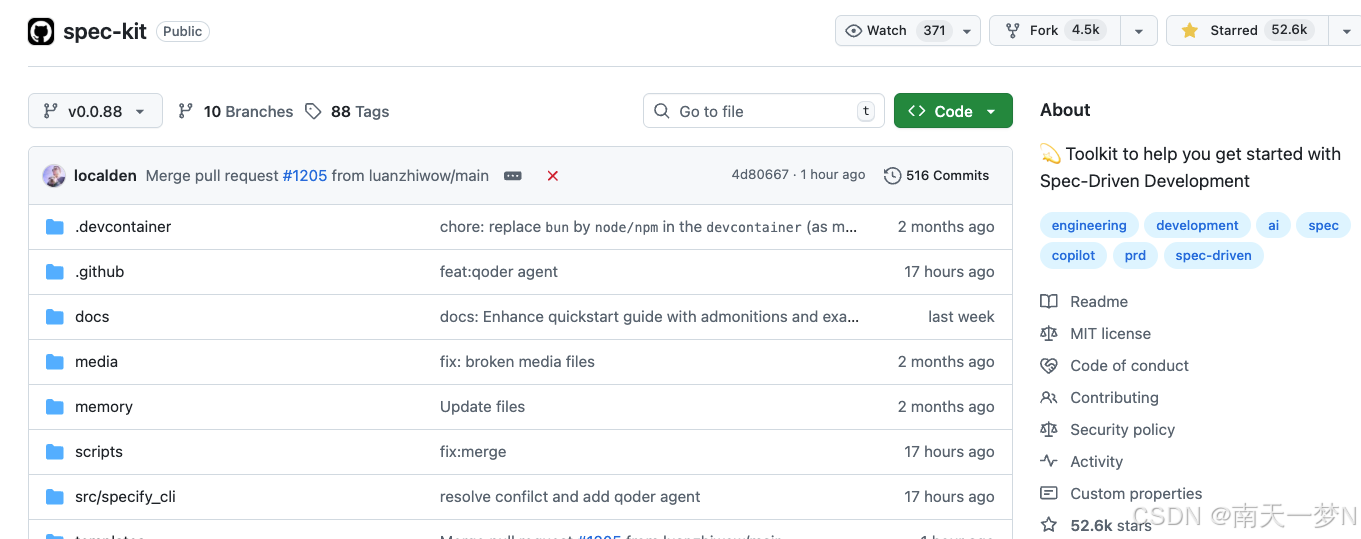 基于SDD,Github创建了一个Spec Kit的项目,开始探索及实践SSD,短短5个月的时间发布了88个版本,迭代非常迅速,目前为止已有5.2w star,非常受欢迎。