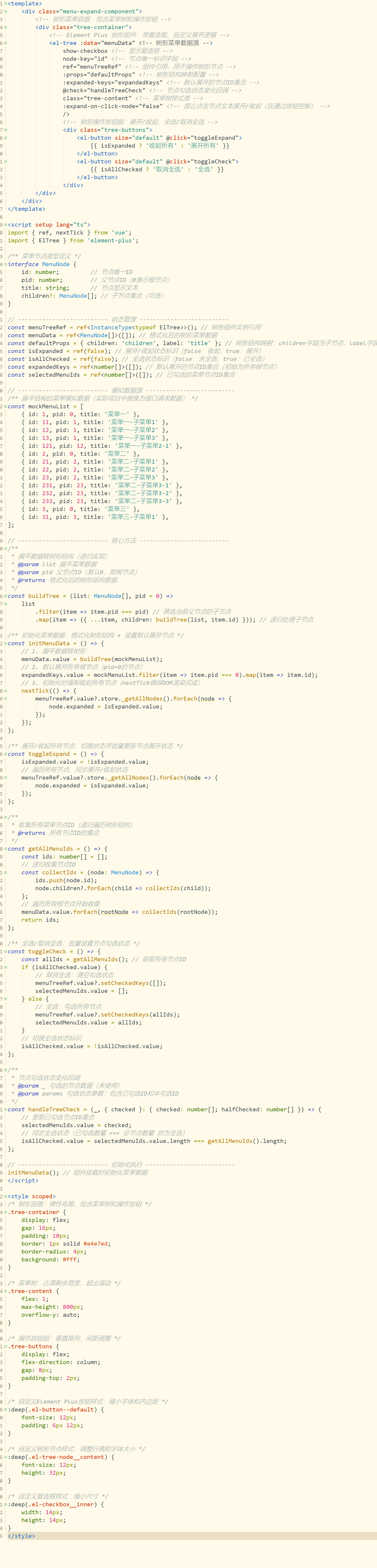 基于Vue 3和Element Plus的树形菜单组件,包含展开/收起、全选/取消功能。模板部分使用el-tree展示层级数据,底部按钮控制展开状态和选择状态。