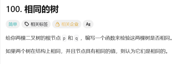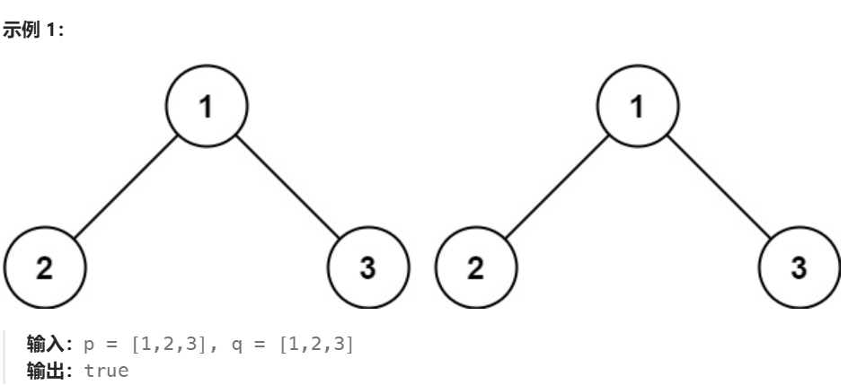 在示例中,我们可以看出,两个二叉树是否相同,除了看节点存储的值 是否相同,还要看树的结构是否相同,即会不会出现一个树当前位置有节点,而另一个树当前位置无节点的情况。