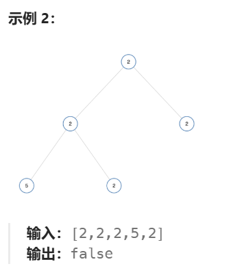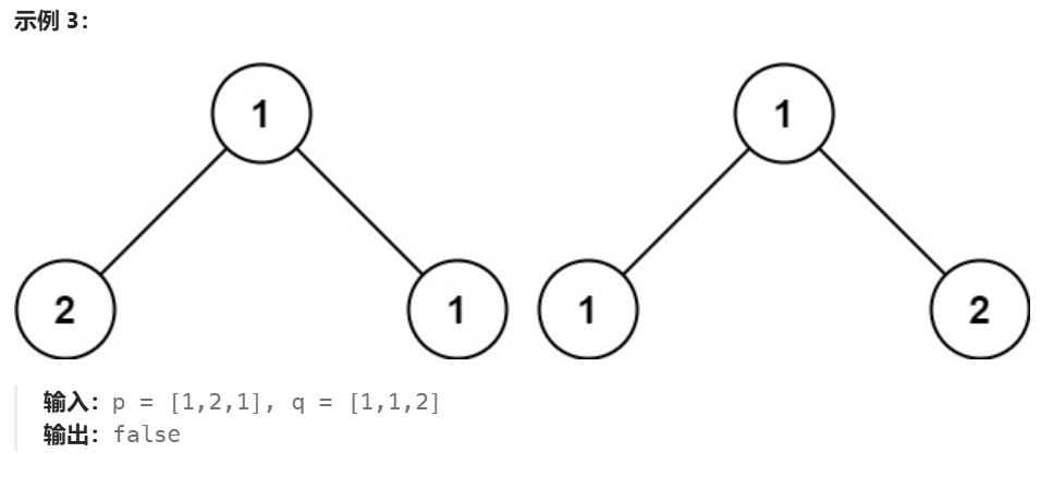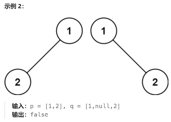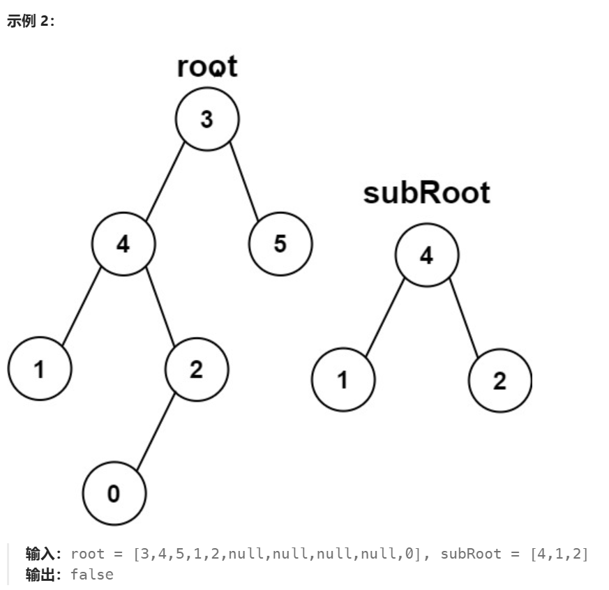 但在第二个示例,尽管根节点的左子树与另一个子树非常相似,但是根节点左子树2节点上多了一个0节点,这是不同的,所以返回false。