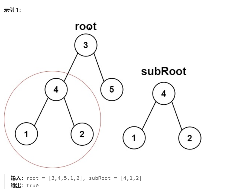 根据题目看两个示例。第一个示例中,根节点的左子树恰好与另一个树相同,所以返回true。
