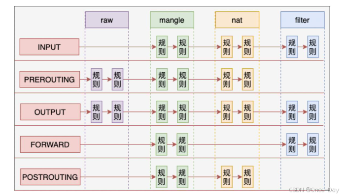 而这些规则根据用途的不同,又可以分为raw、mangle、nat和filter四种表:
