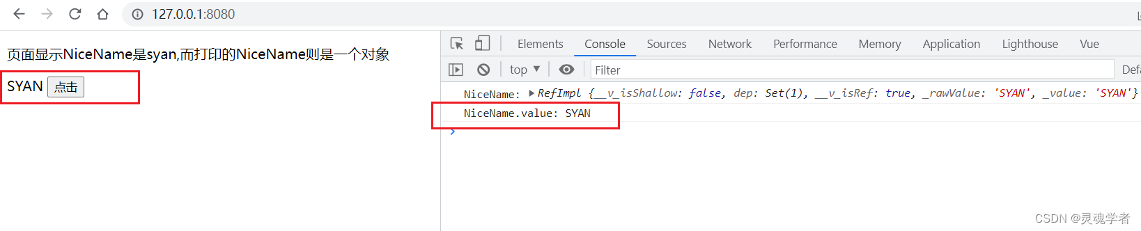 同样的,通过点击按钮让 NiceName 重新赋值,重新赋值的是 NiceName.value ,这也就是ref 没有包装属性value ;