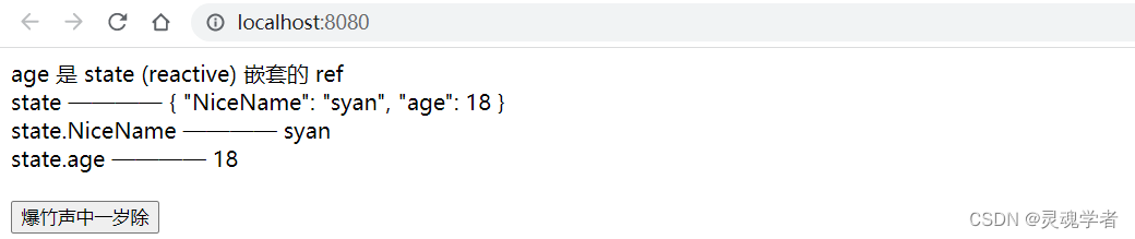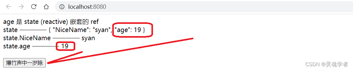 这样看来好像貌似完全没有必要,为什么要将它嵌套进去?放在reactive中就得通过state.age获取,不能通过age.value获得,嵌入到reactive后没有将age单独导出,而是作为state导出,当然将它导出也不是不可以,这种嵌套做法貌似像多次一举,放在reactive对象中不好吗?你可以这样来理解未就是为了两者之间使用得统一性,分开去使用可能看起来会有点混乱,这样一嵌套就使得两者间有统一性!