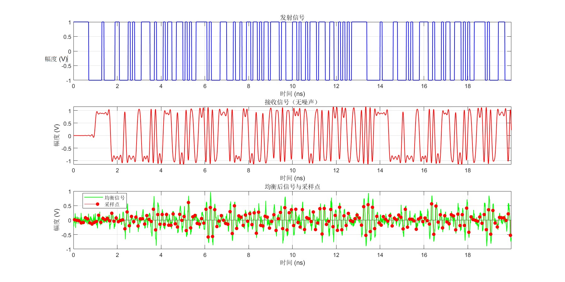 随着调查深入,侦探剧迎来高潮的第三幕:犯罪过程还原 。时域波形对比就是这场数字犯罪的情景重现。发射信号如同受害人遇害前的日常生活轨迹------规律、稳定、可预测,每个比特都像他按部就班的日常行程。接收信号则展现了案发当天的异常行为------波形开始扭曲,节奏被打乱,那些完美的方波变得圆滑而迟疑,就像受害人那天的行踪突然出现了不可解释的偏差。均衡后信号则堪比警方的高科技案件重建模拟,通过数字算法"修正"了部分失真,试图还原最接近真相的过程。而那些精确分布的红色采样点,正是调查组提取的关键时间点证据------就像在监控录像中标出嫌疑人出现的准确时刻。整个时域分析完成了从"静态现场"到"动态过程"的认知飞跃,让我们不仅能看见"尸体"(劣化的信号),更能推演出"谋杀"是如何一步一步发生的。