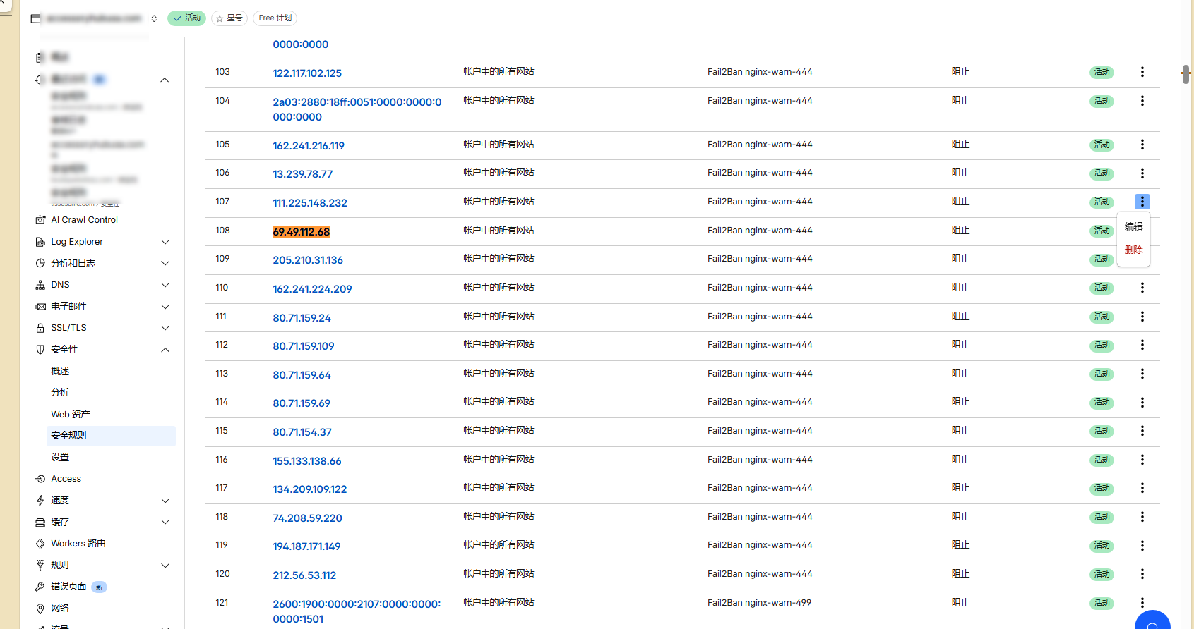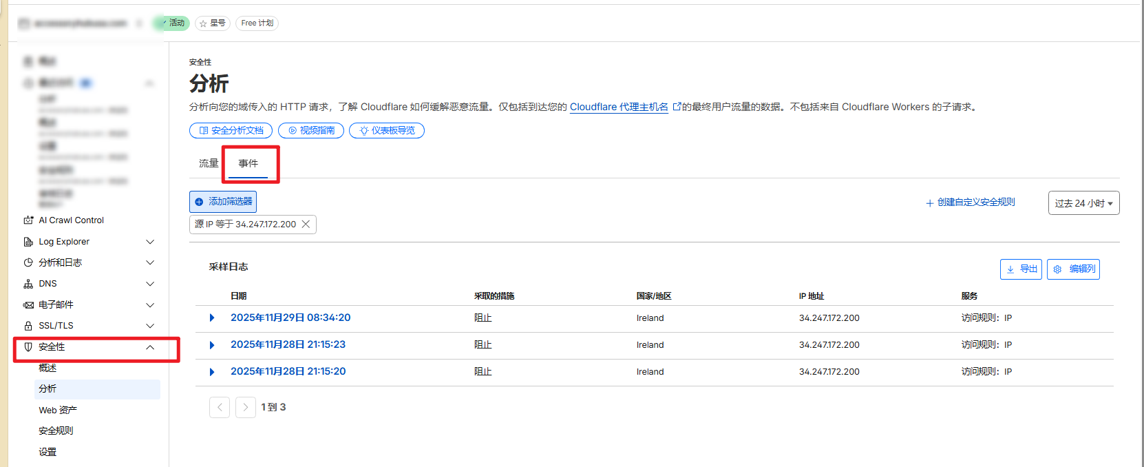 - 查看审计日志或者点击合适的已托管的域名中安全性设置->安全规则(查看全部),然后尝试搜索被封禁的ip(比如上述例子中的