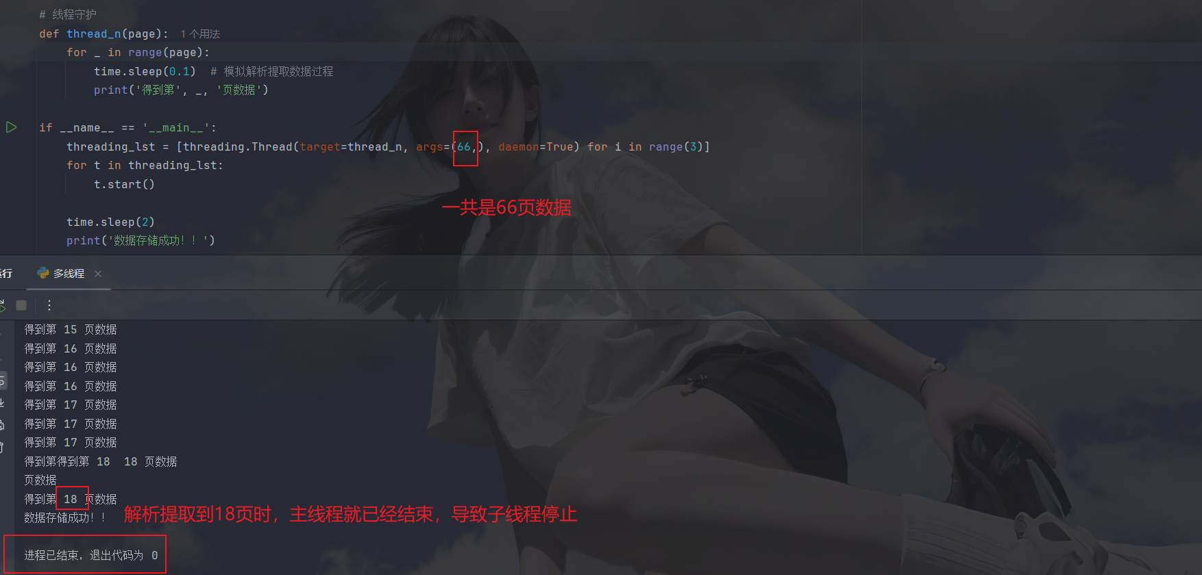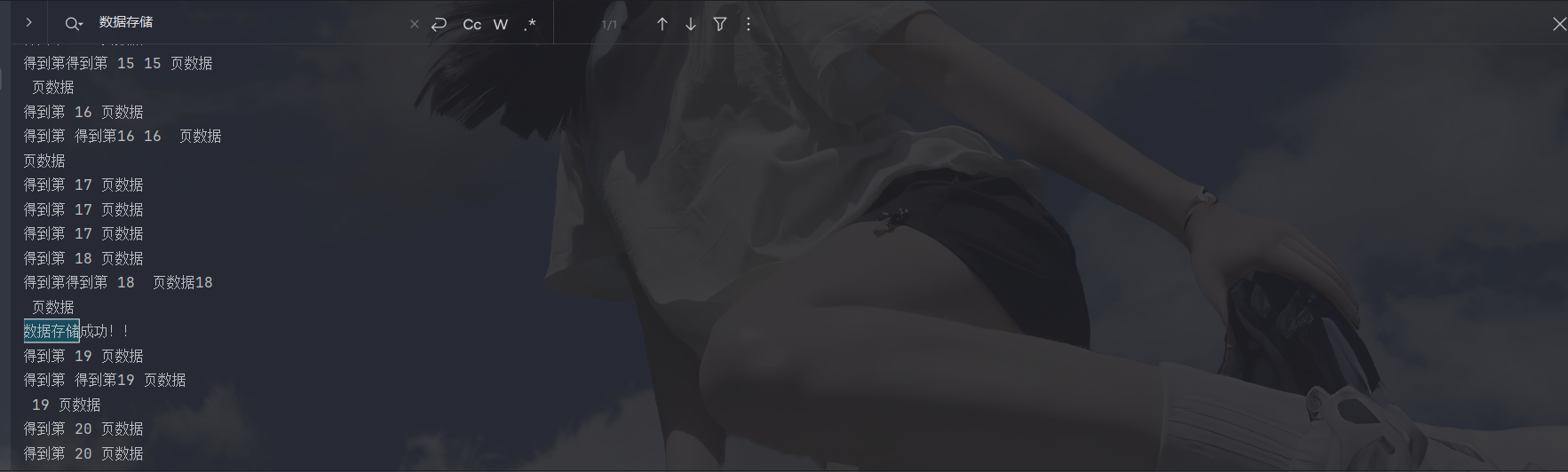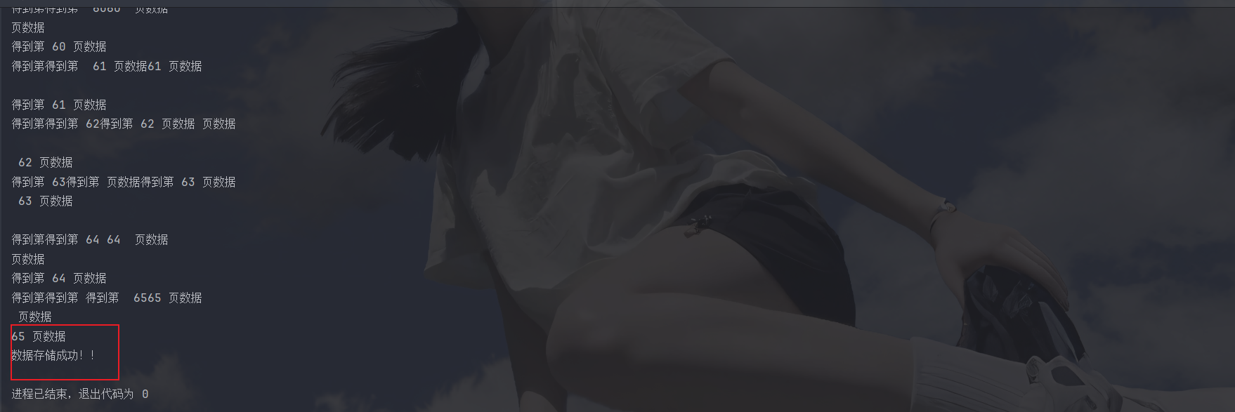 可以看到这里我们数据还没完全爬取完就已经存储完成了,存储完成不说,下面还一直在继续爬取和解析提取数据,这种怎么办,我们可以试试守护线程,开启守护线程后,当主线程停止工作后,子线程就立刻停止: