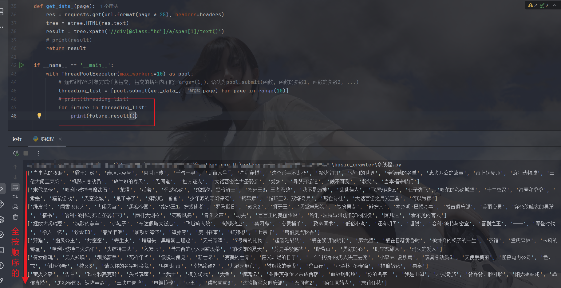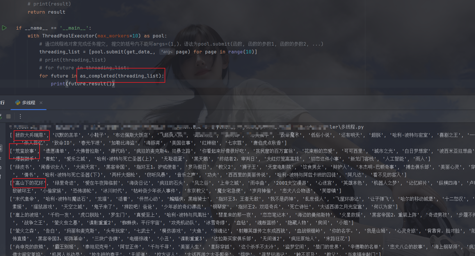 其实这都是result()的锅,他会阻塞线程保证输出是按顺序的,某一页解析完他不返回,而是按创建线程的顺序得到结果,这样会拖慢我们的进度,所以这时候就要用到引入线程池时引入的另一个方法了------as_completed: