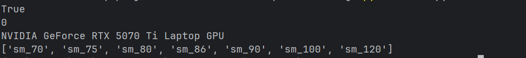 import torch print(torch.cuda.is_available()) # 应该返回 True print(torch.cuda.current_device()) # 获取当前设备 print(torch.cuda.get_device_name(0)) # 获取第一个 GPU 的名字 print(torch.cuda.get_arch_list()) # 应包含'sm_120'