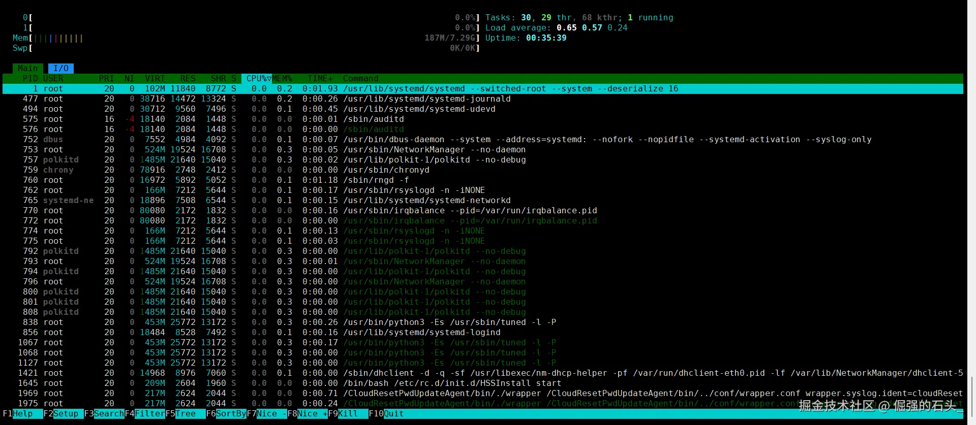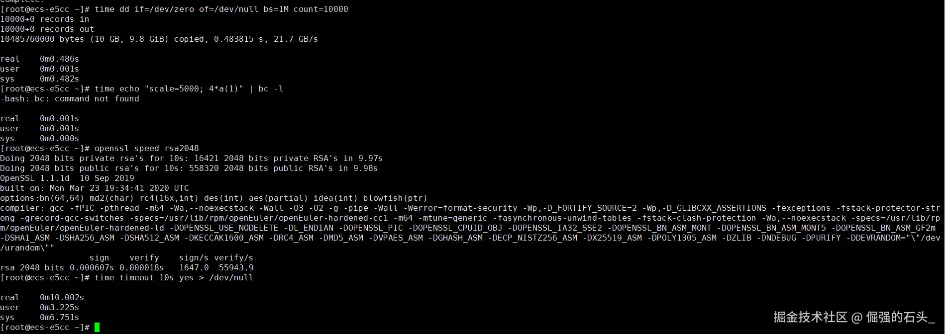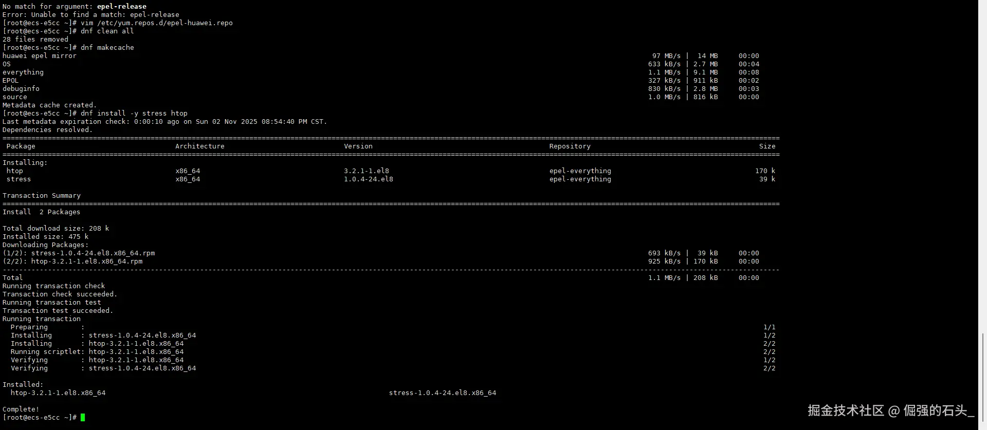 由于openEuler 20.03默认软件源中不包含部分第三方工具,我们需要配置EPEL源来安装htop和stress,并使用系统自带工具替代sysbench。