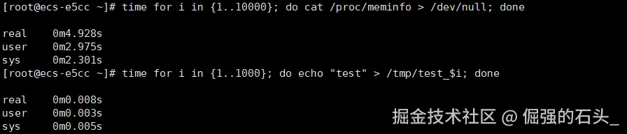 time for i in {1..10000}; do cat /proc/meminfo > /dev/null; done