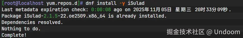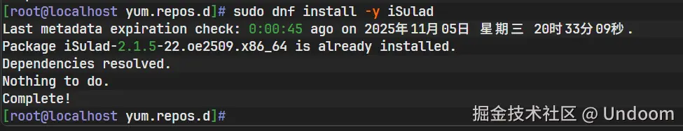 安装完成: 最后的 "Complete!" 字样标志着 iSula 及其核心依赖已成功安装到系统中。
