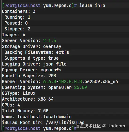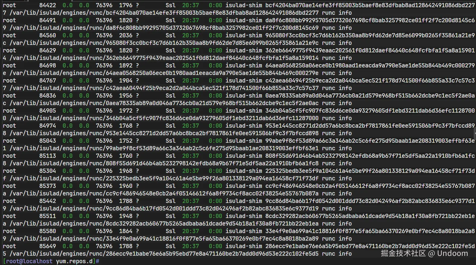 real 0m14.931s: 这是本次测试最核心的性能指标。它表明,在不到15秒的时间内,iSula 系统完成了从接收命令、创建网络命名空间、挂载文件系统、设置cgroups限制到启动容器内1号进程的全部流程,并且重复了100次。user 0m2.094s: 这代表CPU在用户空间执行代码所花费的时间,主要消耗在isula客户端工具的解析和发送请求,以及isulad守护进程处理业务逻辑的部分。sys 0m2.388s: 这代表CPU在内核空间执行代码所花费的时间,主要用于响应isulad发起的系统调用,如clone()、mount()等,这些是创建容器的底层操作。- 总CPU时间 :