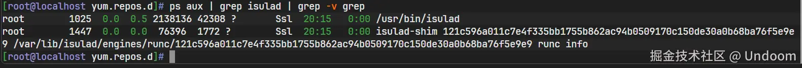 在场景二完成后,系统正处于运行100个alpine容器的状态。此时,我们重复场景一的操作,再次使用ps命令观察isulad进程的资源占用情况。
