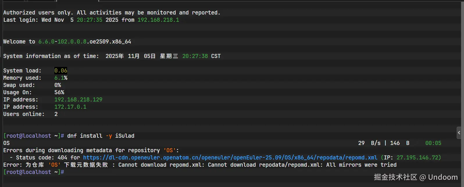 注意点: 在此步骤中,若遇到 dnf 仓库无法访问的问题,通常是由于网络问题或使用了非LTS的过期版本导致软件源失效。强烈建议使用如 openEuler 22.03 LTS 这样的长期支持版本,以保证软件源的长期稳定可用,这是所有自动化部署和测试的基础。若网络环境特殊,可参考文末附录关于配置备用镜像源的方法。