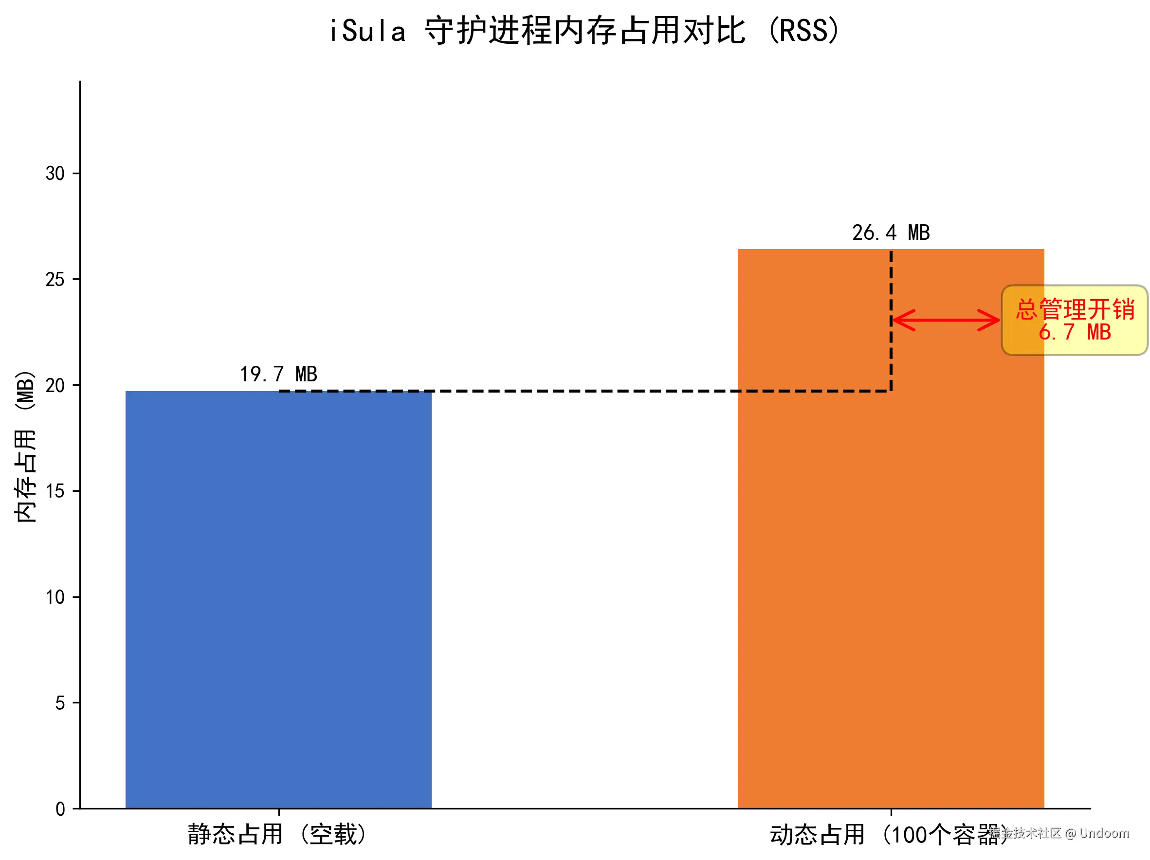两根柱子的高度差异非常小,直观地揭示了从空载到管理100个容器,isulad的内存占用增长幅度极其有限。在这两根柱子旁边,可以再放置一个更细的柱子或者数据标签,明确指出"总管理开销",其值为 6.7 MB。这样的可视化图表能让读者一目了然地认识到 iSula 的轻量化特性。