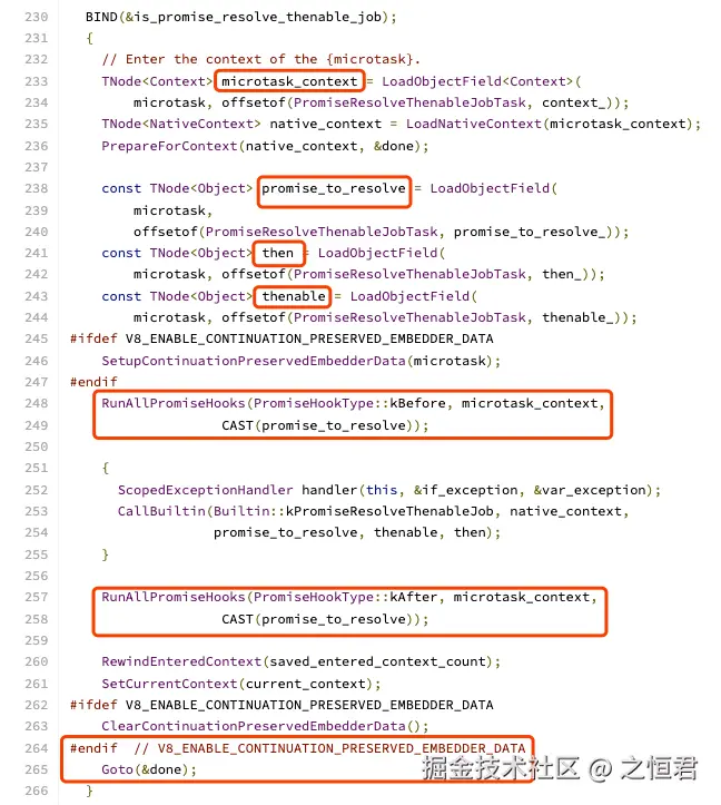 CallBuiltin(Builtin::kPromiseResolveThenableJob, native_context, promise_to_resolve, thenable, then)f. 调用 RunAllPromiseHooks(PromiseHookType::kAfter, microtask_context, promise_to_resolve)(after hook)并恢复上下文/清理。
